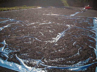 ![]() 天日乾燥中の玄蕎麦 ちょっとイタズラ… 「黒姫」の文字と左下の仁右衛門 |